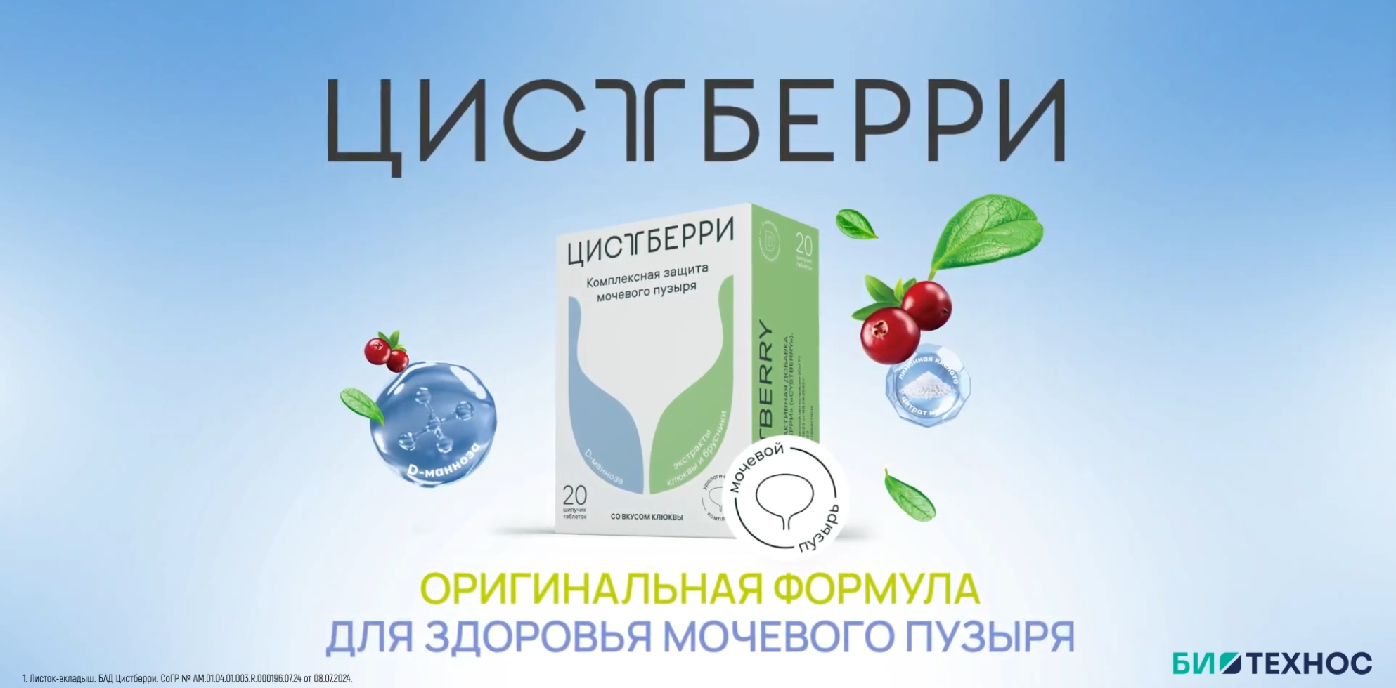 1. Листок-вкладыш. БАД Цистберри. СоГР № AM. 01.04.01.003.R.000196.07.24 от 08.07.2024. 2. Громова О.А., Торшин И.Ю., Тетруашвили Н.К. Системный анализ исследований по D-маннозе рассматривает ее применение при рецидивирующих инфекциях мочеполовых путей у женщин репродуктивного возраста. Акушерство, Гинекология и Репродукция. 2019; 13(2):119–131. 3. Jepson R.G., Williams G., Craig J.C. Cranberries for preventing urinary tract infections. Cochrane Database Syst. Rev. 2012, 10, CD001321. 4. Vilkickyte G., Petrikaite V., Pukalskas A., Sipailiene A., Raudone L. Exploring Vaccinium vitis-idaea L. as a potential source of therapeutic agents: antimicrobial, antioxidant, and anti-inflammatory activities of extracts and fractions. J Ethnopharmacol. 2022, 292, 115207. 5. Содержание компонентов в 2 таблетках.